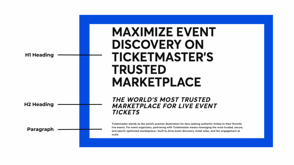 Ad esempio, un H2 dedicato ai “Dettagli dell’evento” può includere H3 per “Data e orario”, “Location” e “Informazioni sul parcheggio”. Questo formato chiaro e scansionabile migliora l’esperienza dei fan e supporta le performance SEO complessive.